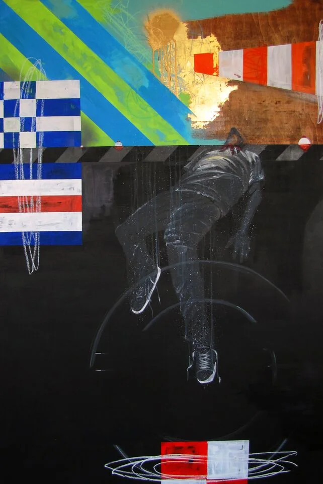 The day after Michi Meko’s recent exhibit Pursuit: Almost Drowned opened at Alan Avery Art Company, he almost drowned. “This is not a stunt to sale [sic] paintings. Nature just tested my metaphor and the ole boy stayed afloat,” he posted on Facebook next to a photo of him looking exhausted but delivered.